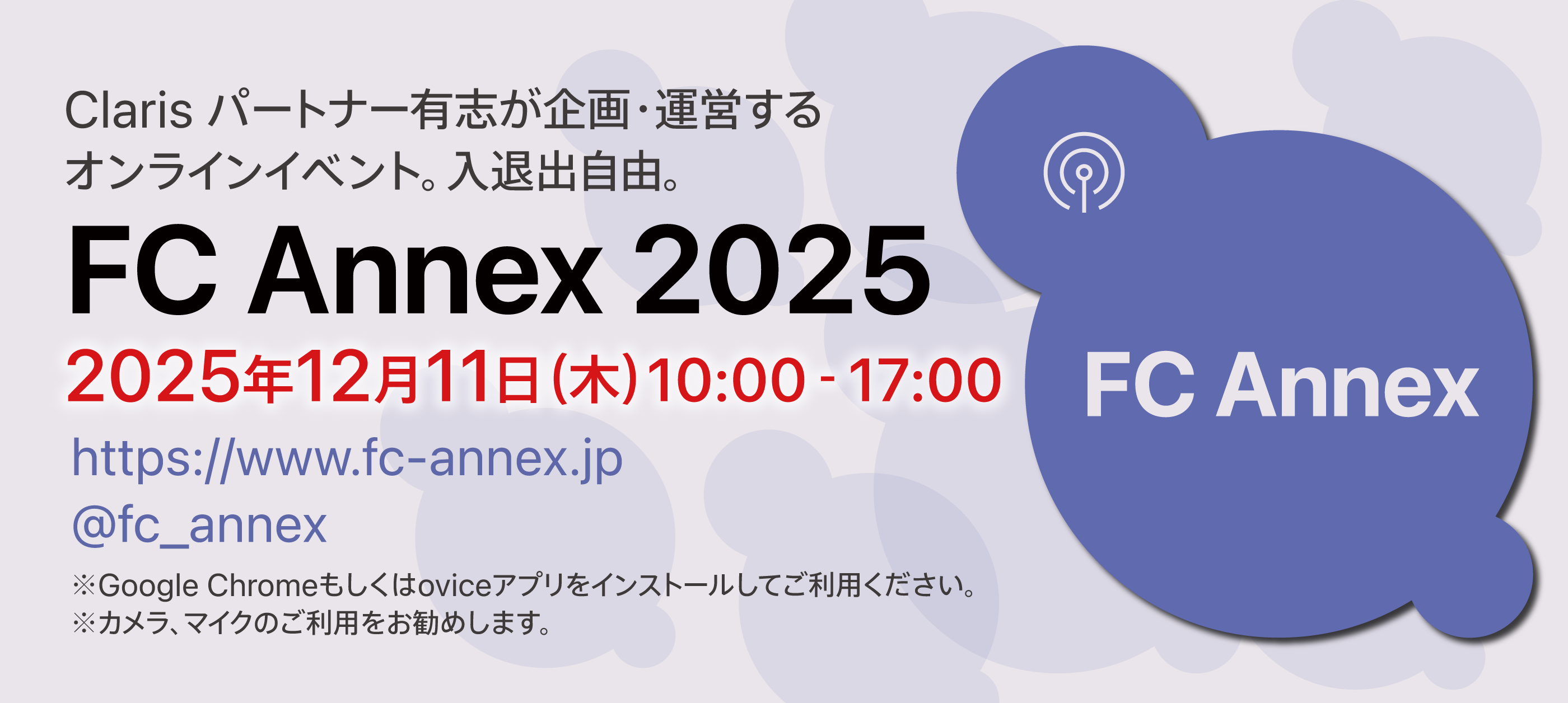 Claris パートナー有志が企画・運営するオンラインイベント FC Annex 2025 2025年12月11日(木)10:00-17:00 ※Google Chromeもしくはoviceアプリをインストールしてご利用ください。 ※カメラ、マイクのご利用をお勧めします。
